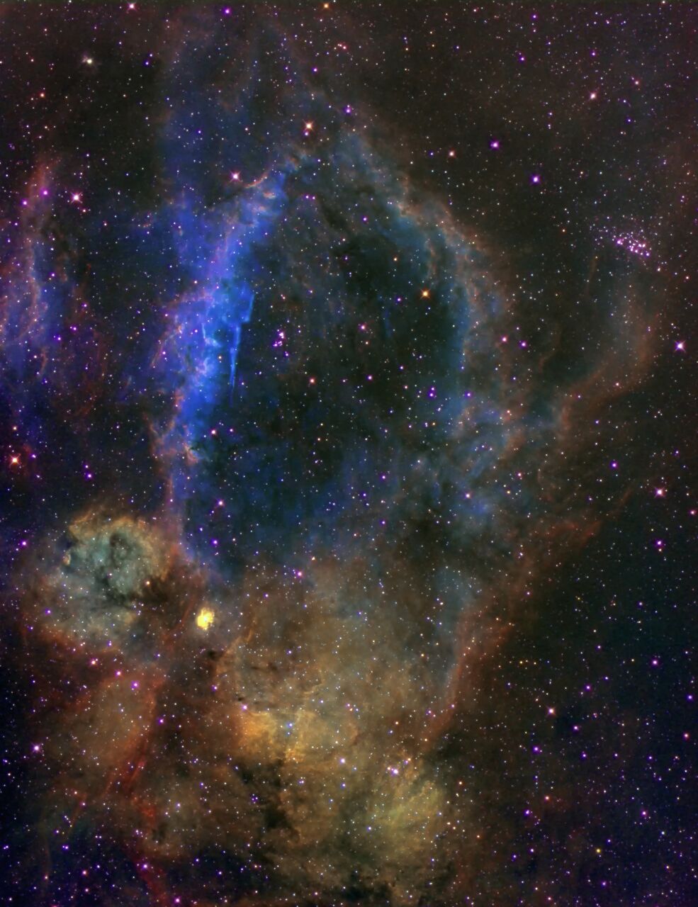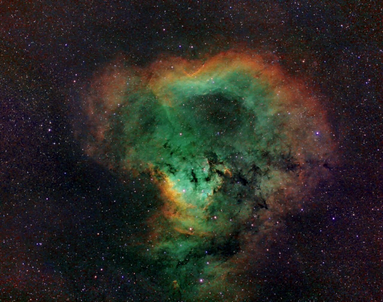 また、硫黄輝線の効果もあって、南部の星雲の周辺に赤い領域が認められます。