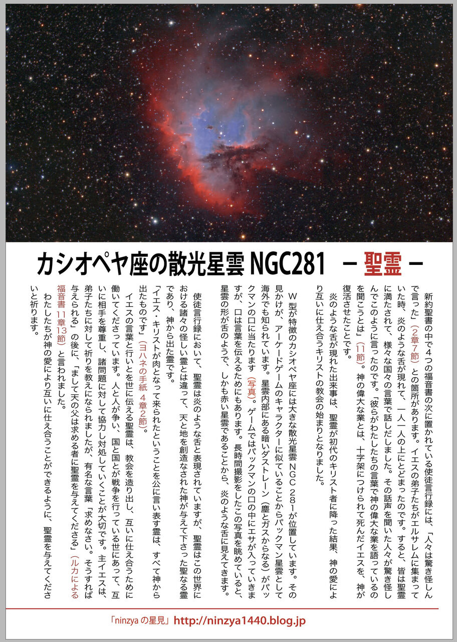 散光星雲NGC281が聖書の記述にある聖霊に似ていることからその天体写真を選びました。